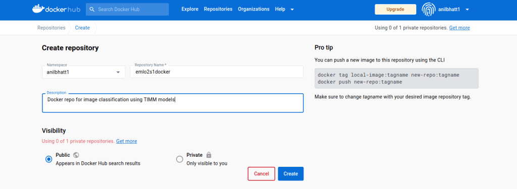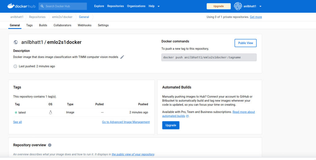 - Here we are tagging the emlo2s1docker image present in our local with anilbhatt1/emlo2s1docker repo that we created in docker hub above.