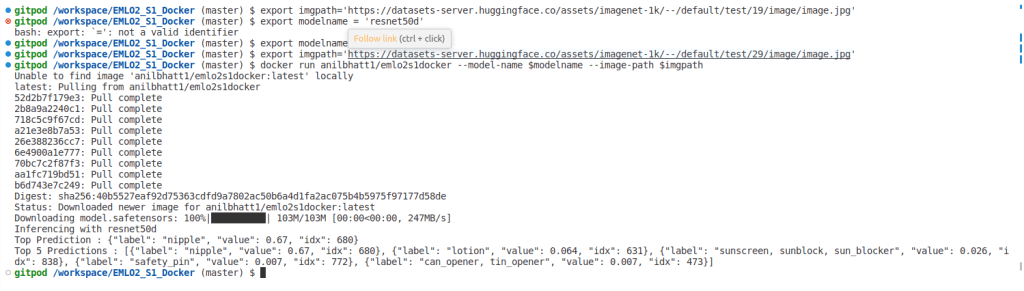 docker run anilbhatt1/emlo2s1docker --model-name $modelname --image-path $imgpath